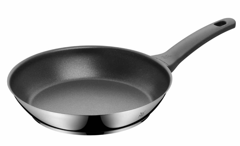 Eine Edelstahlpfanne aus WMF’s Cromargan-Material (eine Art Edelstahl), oft mit einem verkapselten Boden für gleichmäßige Erwärmung. Keine Antihaftbeschichtung. Es ist großartig zum tiefen Bräunen und Ablöschen — ideal, wenn Sie Pfannensaucen möchten. Edelstahl hält hohen Temperaturen und Metallutensilien ohne Bedenken stand. Viele WMF-Pfannen sind auch spülmaschinenfest und passen in moderne Küchen.