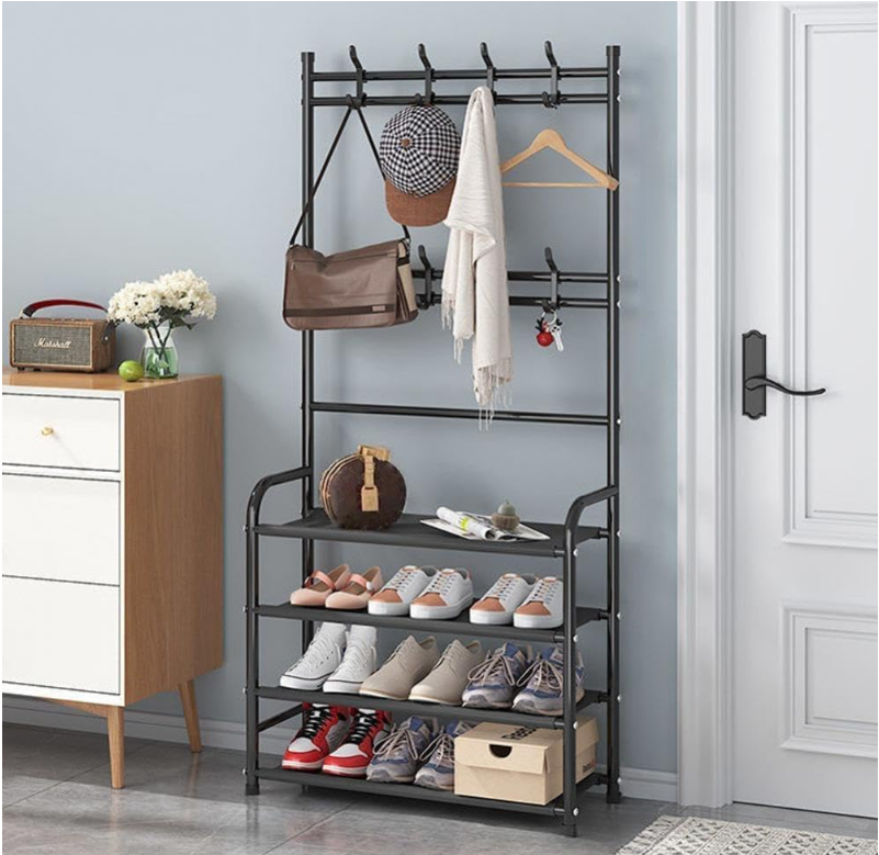 Warum separate Gestelle, wenn ein einziges Stück alles kann? Dieses Metallregal integriert Schuhregale mit Haken für Mäntel, Taschen, Schlüssel und Hüte – perfekt für einen ordentlichen und effizienten Eingangsbereich.